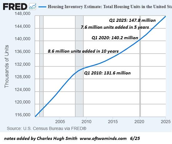 Let’s look at some charts for context. Here is a chart of total housing units. Confounding the conventional narrative of a “housing shortage,” the U.S. added 7.6 million housing units in the five years 2020-2025, a rate far higher than the 8.6 million units added over 10 years 2010-2020.