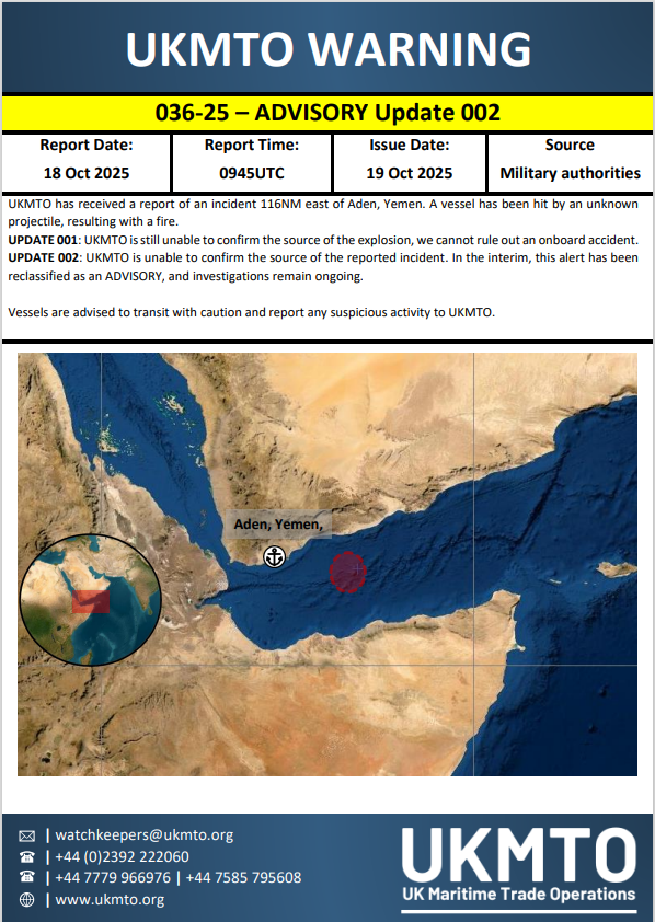 — UKMTO Operations Centre (@UK_MTO) October 18, 2025