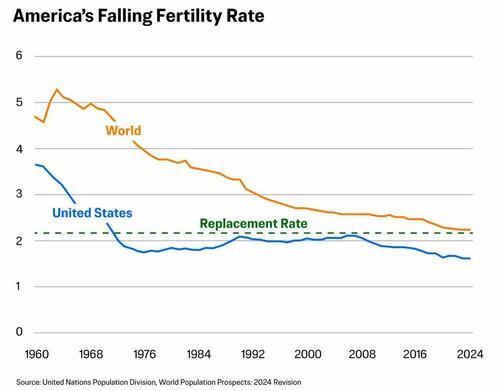 Meanwhile, the general fertility rate—the number of live births per 1,000 women of childbearing age—has dropped to record lows. The North American rate plummeted from 3.1 in 1950 to 1.6 in 2023, according to a McKinsey Global Institute analysis published in January.