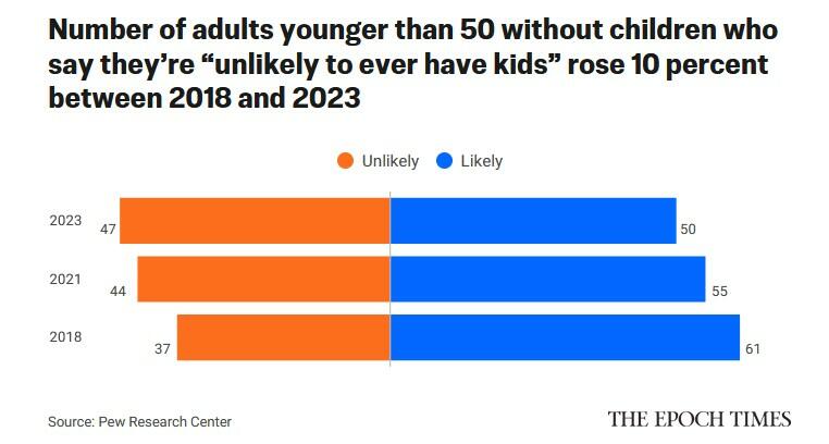 Moreover, some evidence suggests that adults are not simply waiting longer to have children; many are opting out of parenthood entirely. A 2024 Pew study reports that the number of adults younger than 50 without children who say they are “unlikely to ever have kids” rose by 10 percent between 2018 and 2023.