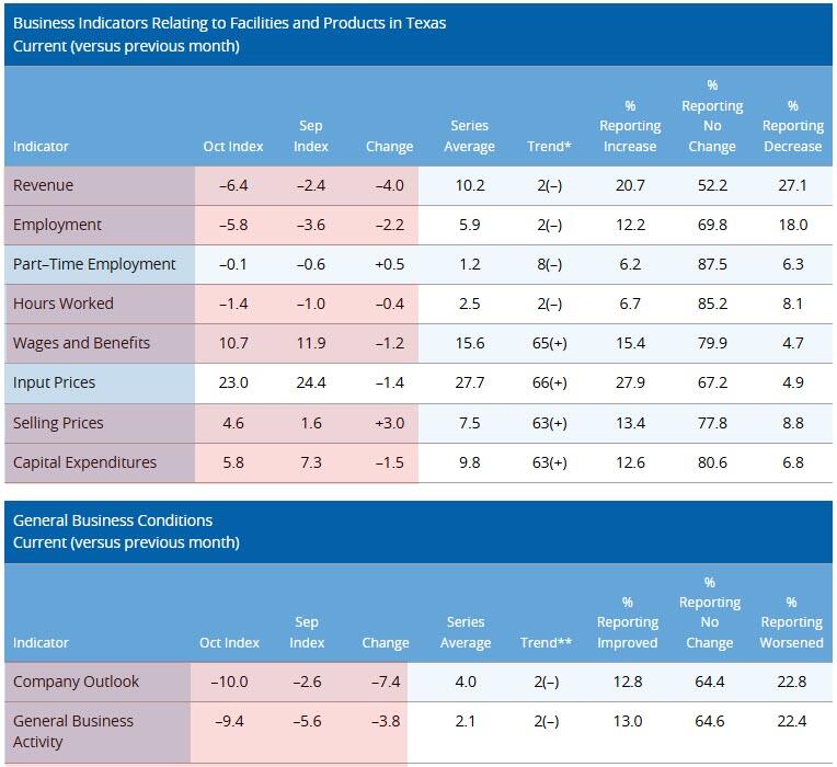 Texas service sector activity contracted further in October, according to business executives responding to The Dallas Fed’s survey…