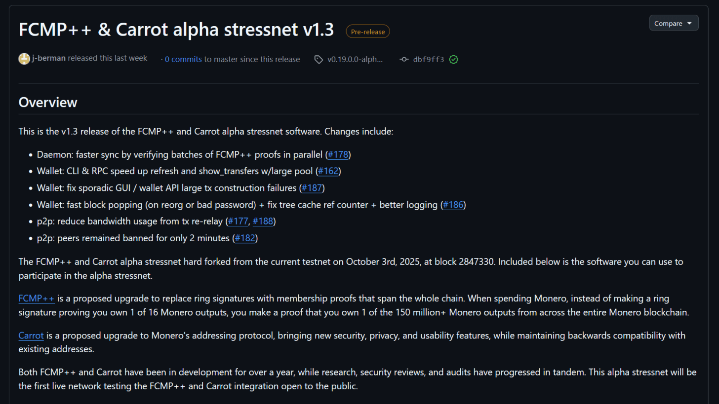 j-berman has released FCMP++ & Carrot alpha stressnet v1.3, the latest pre-release of Monero’s upcoming Full Chain Membership Proofs (FCMP++) and Carrot upgrades. This version adds faster daemon sync through parallel proof verification, improved wallet refresh performance, fixes for large transaction construction, reduced P2P bandwidth use, and shorter peer bans. The stressnet, which hard forked on October 3, 2025 (block 2847330), marks the first live public test of the FCMP++ and Carrot integration. FCMP++ replaces traditional ring signatures with full-chain membership proofs, while Carrot enhances Monero’s addressing protocol to improve privacy and usability. Users are encouraged to join the #monero-stressnet Matrix room to participate and report bugs. Detailed setup instructions, binaries, and source code are available on the seraphis-migration/monero repository. This is alpha software with a small anonymity set. Testers should only use it with caution and small amounts of XMR.