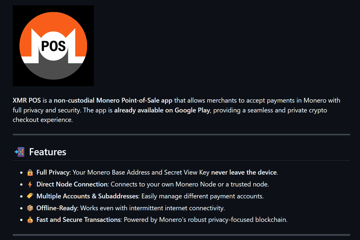 felipebrunet released v1.0.4 of the open source Monero Point of Sale app for Android, a non custodial XMR only payment tool designed for merchants. The app supports multi device setups, prevents address reuse, and connects directly to a user defined Monero node while keeping the base address and secret view key stored locally for full privacy. As a new project, users are advised to review the code before use.