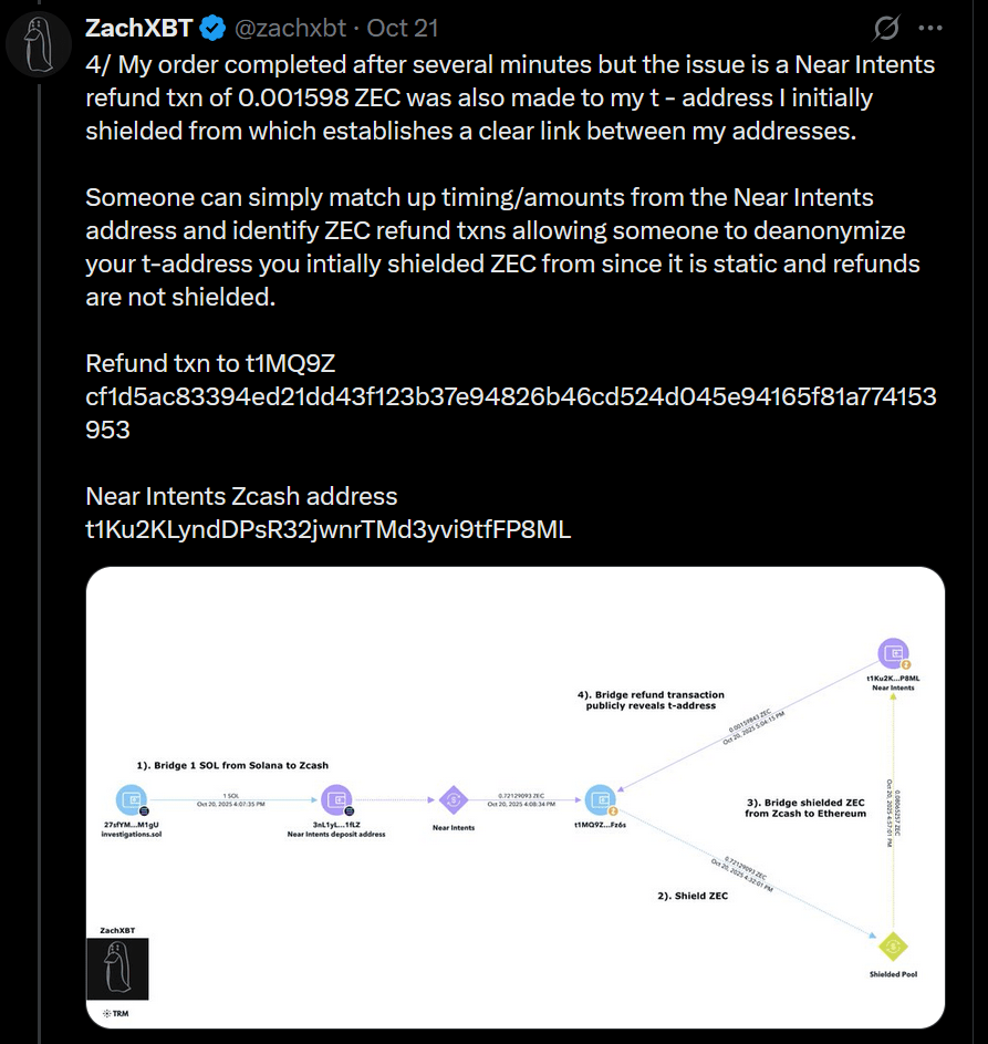 Popular blockchain sleuth ZachXBT tested Zcash’s new Near Intents bridge and found that refund transactions linked his shielded and transparent addresses, compromising privacy. While Zashi plans to patch the flaw, the incident highlights why Monero’s protocol level privacy remains unmatched, offering users true fungibility without relying on fragile crosschain workarounds.