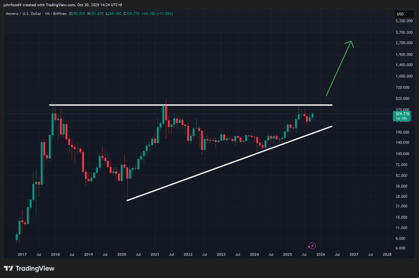 XMR/USDT has an 8 year ascending triangle, one of the longest consolidations in crypto. A breakout could trigger a move into the four figure range. The quiet accumulation phase is ending for XMR.
