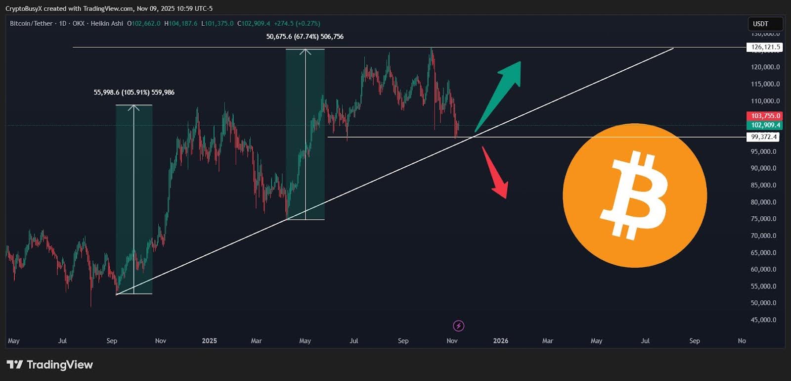 Bitcoin is again hovering near $100,000, a level that has served as a solid psychological floor for months. The analyst’s chart shows BTC holding this area while moving within a long-term rising structure.