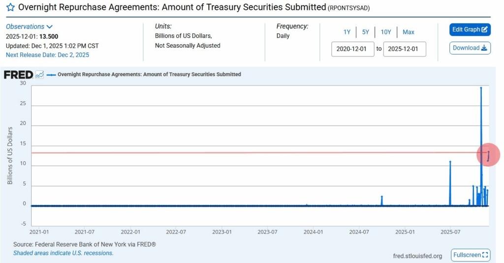 Liquidity has shifted significantly more favorably for risk assets and equities. On December 1, 2025, the Federal Reserve (Fed) officially ended its quantitative tightening (QT) program and is scheduled to cut overnight lending rates by another 0.25% next week. The Fed has simultaneously conducted a large overnight repurchase agreement injection of approximately $13.5 billion into the banking system, which is the second-largest liquidity injection since the COVID-19 era began.