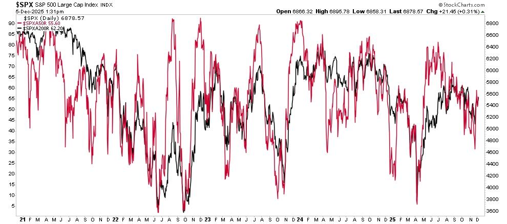 “Seasonality, positioning, and trend still lean in favor of the bulls. December is historically one of the stronger months for equities, particularly when the market is already up by double digits year-to-date. Expectations for a December Fed rate cut, and a gradual cooling of inflation, support the “soft-landing” narrative, while corporate buybacks and under-invested managers create fuel for a “chase into year-end” if resistance gives way. With volatility easing and breadth improving, the path of least resistance near term remains higher if key support zones are maintained.”