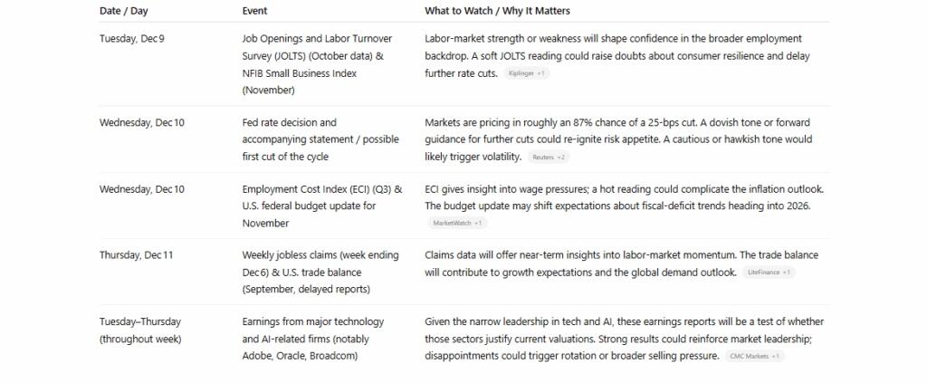 This week offers a high‑stakes test of sentiment. If liquidity (through the Fed’s policy) aligns with solid economic and earnings data, the rally could broaden beyond mega‑caps and extend into 2026. If not, this “year‑end bounce” risks fading or turning into a broader reassessment.