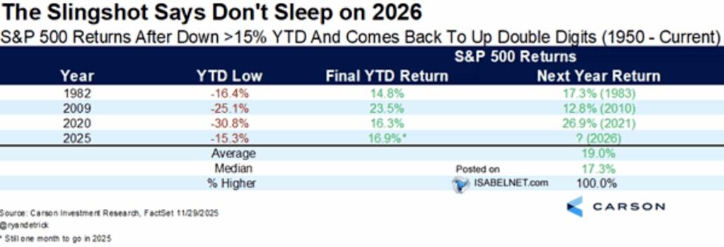 Statistically, there is also a bullish case to be made. As shown in the table below, many have forgotten about the ~20% decline we saw in March and April this year. That “reset” was necessary as 20% corrections, while they happen, are more “severe” events that reverse overly bullish sentiment and positioning. However, more notable was the sharp reversal from the April lows. Such a selloff and reversal has only occurred four times since 1950. While there is still roughly one month left in 2025, if returns hold at their current levels, it suggests that 2026 could have a positive year as bullish momentum continues.