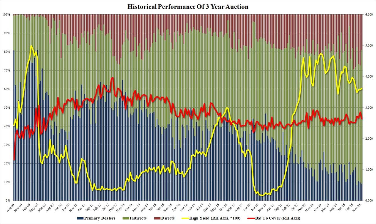 Overall, this was a very solid auction, one which came at just the right time: with 10Y yields surging today just shy of 4.20% before retracing the move and dipping by about 1bp on the solid 3Y auction results.