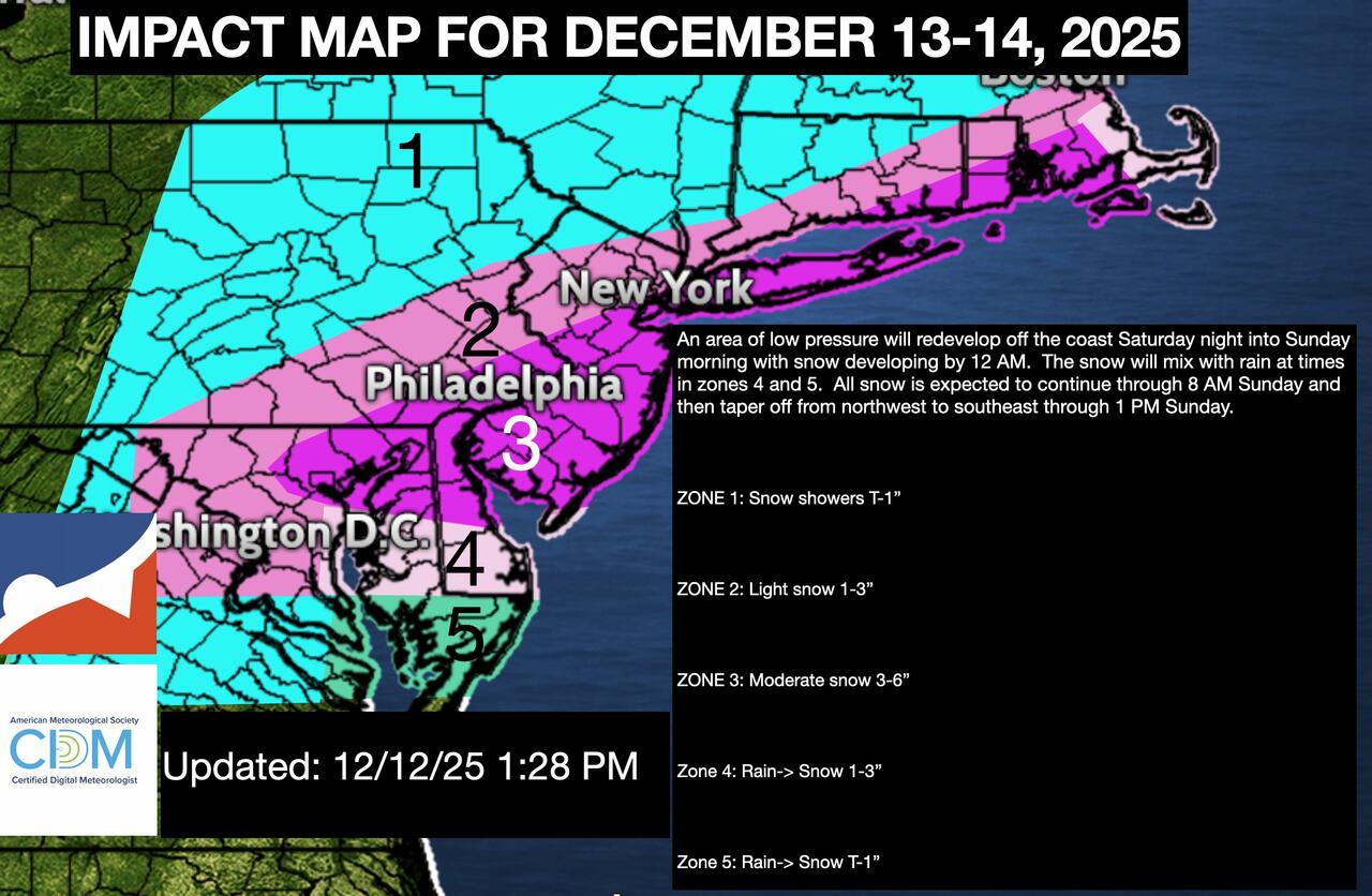 “An area of low pressure will redevelop off the coast Saturday night into Sunday morning with snow developing by 12 a.m. The snow will mix with rain at times in Zones 4 and 5. All snow is expected to continue through 8 a.m. Sunday and then taper off from northwest to southeast through 1 p.m. Sunday,” a meteorologist at NY NJ PA Weather wrote in a report.