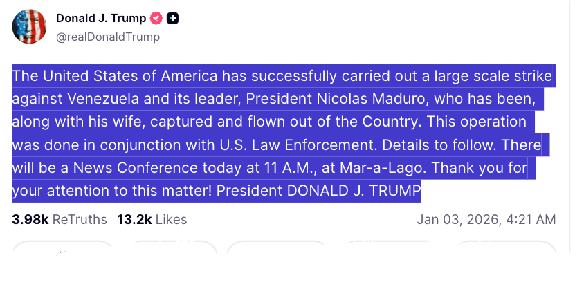 Trump took to his Truth Social account to announce that Venezuelan socialist leader Nicolas Maduro and his wife had been captured and were en route by air out of the country.