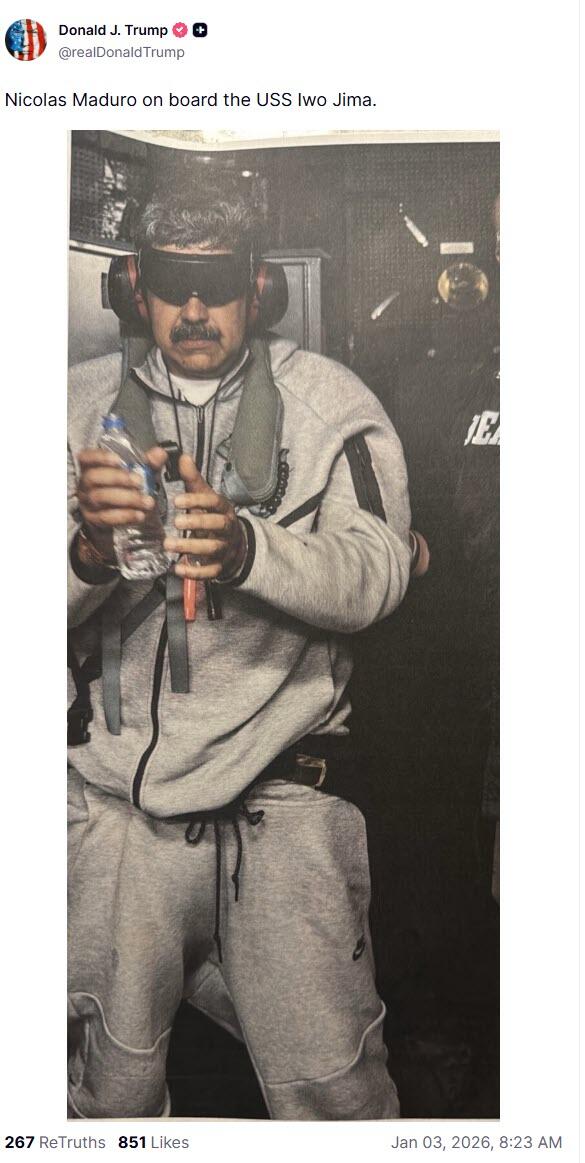 Additionally, President Trump has posted an image of Maduro on board the Iwo Jima, from which he will reportedly be transferred to an FBI plane at Guantanamo Bay heading to New York…