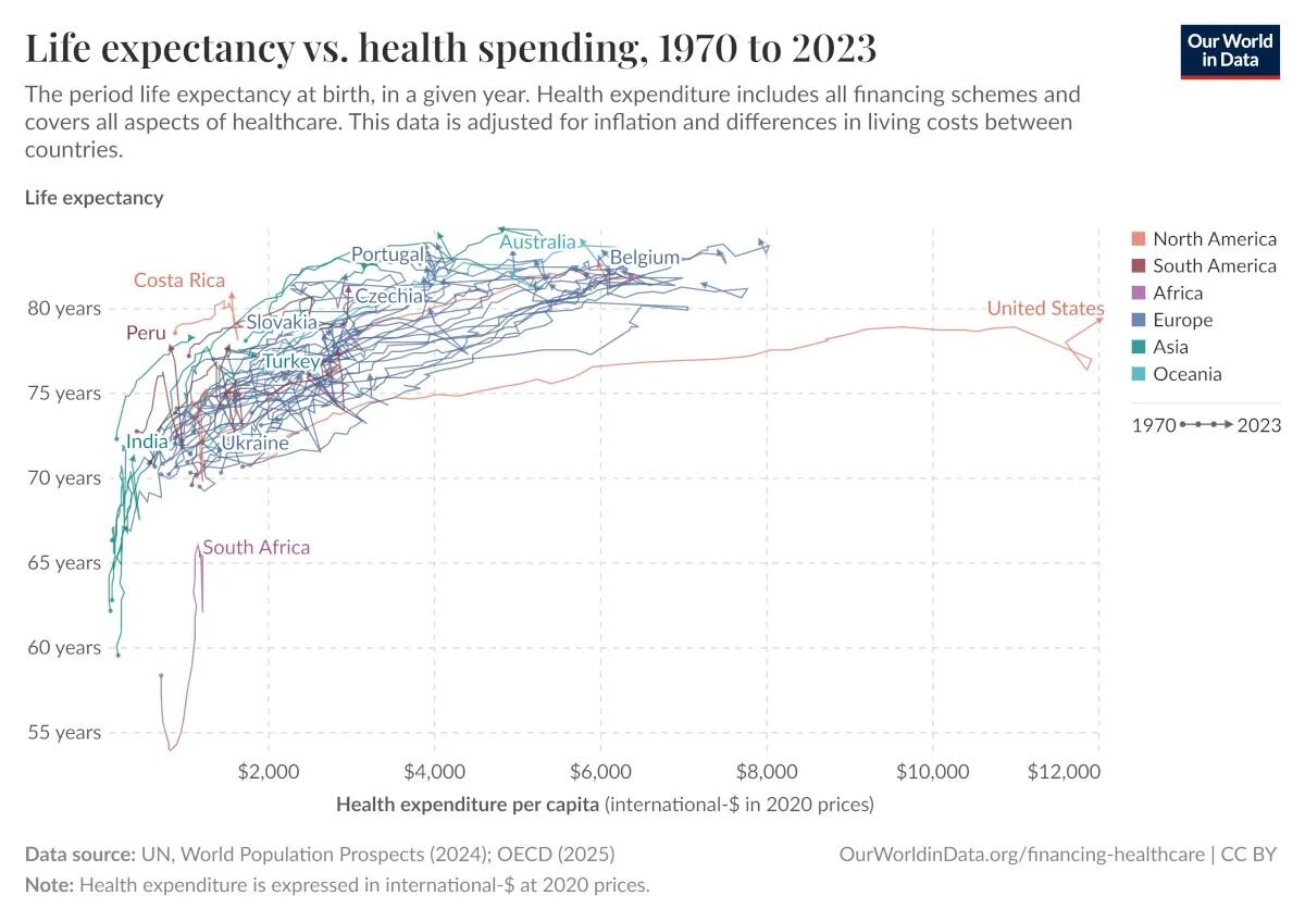 Today’s visual from Our World in Data that compares life expectancy with healthcare spending per capita hints at exactly this paradox.