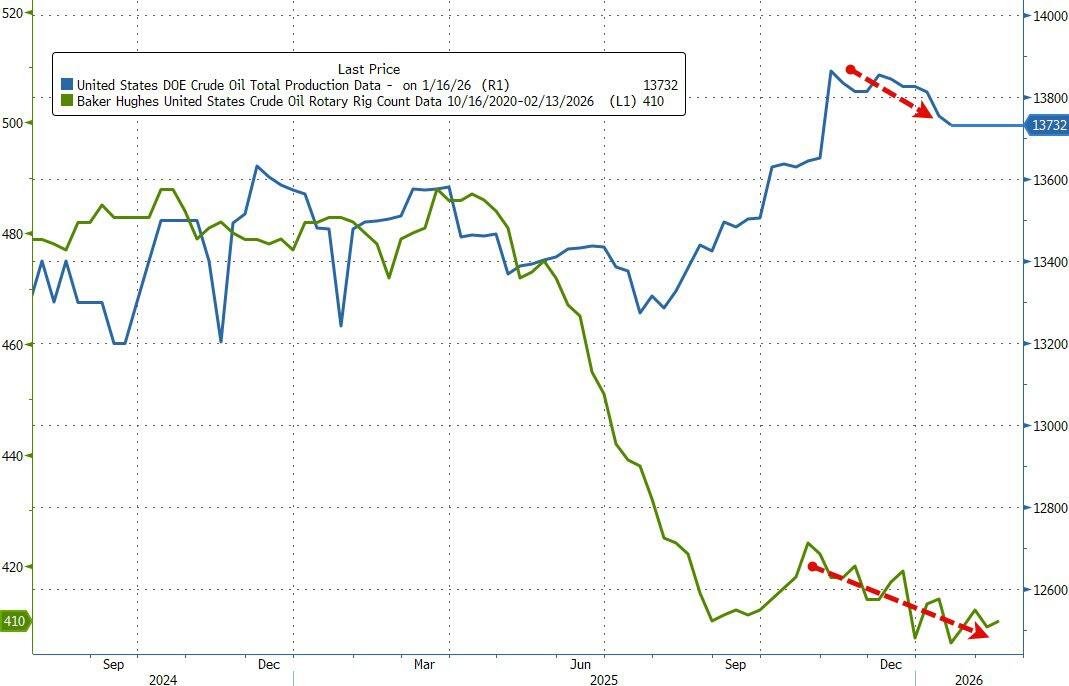US Crude production dipped a little from record highs as rig counts continue to trend lower…