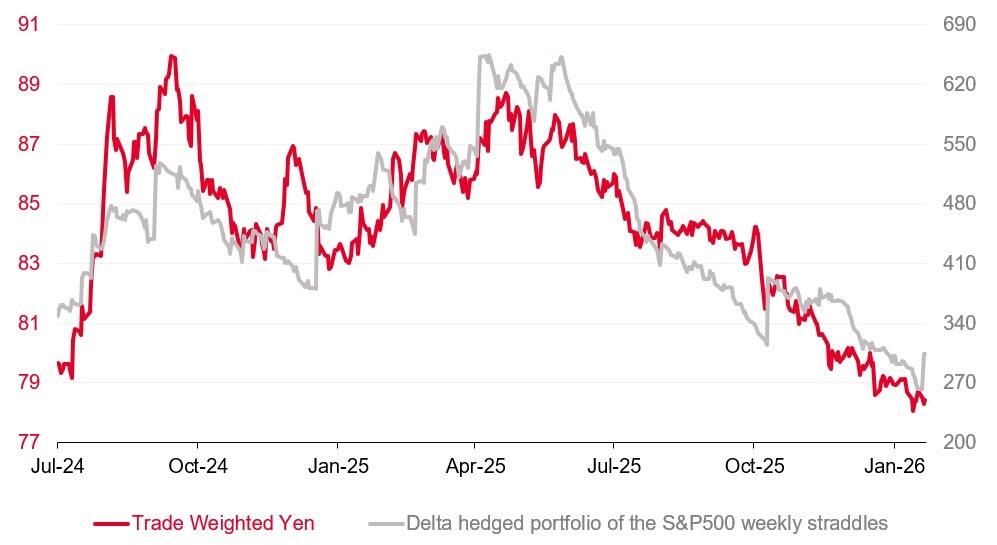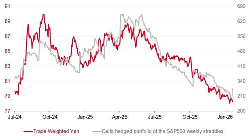 Since the summer 2024 equity market sell-off (the yen carry-trade unwind)…there has been a curious relationship between the Japanese currency and the performance of short-term equity volatility in the US.