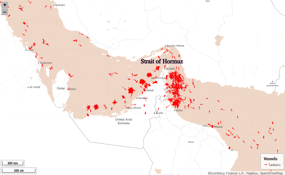According to Bloomberg AIS ship-tracking data, both the entrance and exit of the Hormuz chokepoint remain clogged with tankers. Traffic flows were still muted as of 19:50 ET.