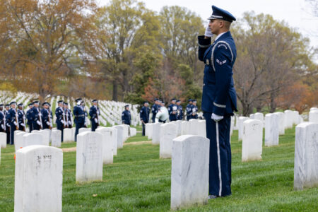 Over 80 years later, a four-ship of P-51s roared over the rolling hills of Arlington’s Section 38—with one P-51 peeling off to create a “Missing Man” formation. That formation was led by four of America’s most cutting-edge fighters, F-35 Lightning IIs from the 187th Fighter Wing of the Alabama Air National Guard.