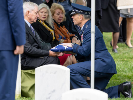 His family was presented with an American flag that had recently flown in fighter jets piloted by Chairman of the Joint Chiefs of Staff Air Force Gen. Dan Caine and Air Force Chief of Staff Gen. Kenneth S. Wilsbach.